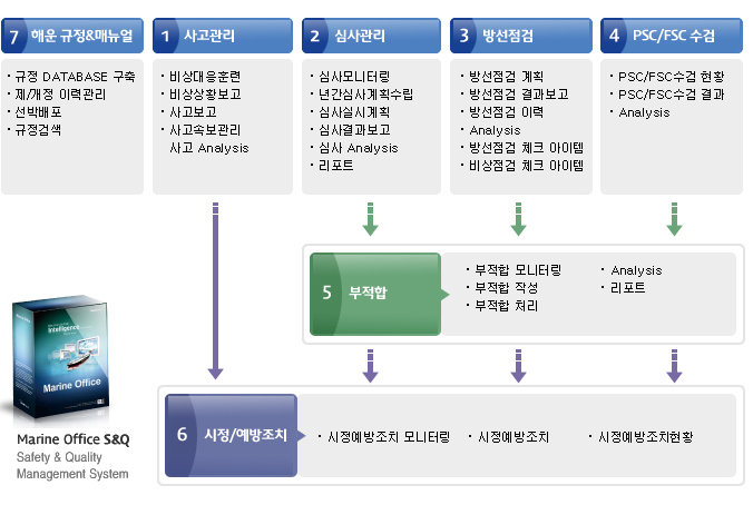 ¸¶¸°¿ÀÇǽº ¾ÈÀüǰÁú°ü¸®½Ã½ºÅÛ (Safety & Quality Management System)´Â ¼±¹Ú ¹× À°»óÀÇ ¾ÈÀü°ú ǰÁúÀ» °ü¸®Çϱâ À§ÇÑ ¼Ö·ç¼ÇÀ¸·Î »ç°í°ü¸® ¾÷¹«ÀÇ ½Å¼ÓÇÑ Áö¿ø , °¢Á¾ ½É»ç/°Ë»ç °ü¸®¾÷¹«ÀÇ Áö¿ø , ±ÔÁ¤/¸Å´º¾óÀ» ÅëÇÕ °ü¸®ÇÏ´Â ¾÷¹«·Î ±¸ºÐ µË´Ï´Ù.